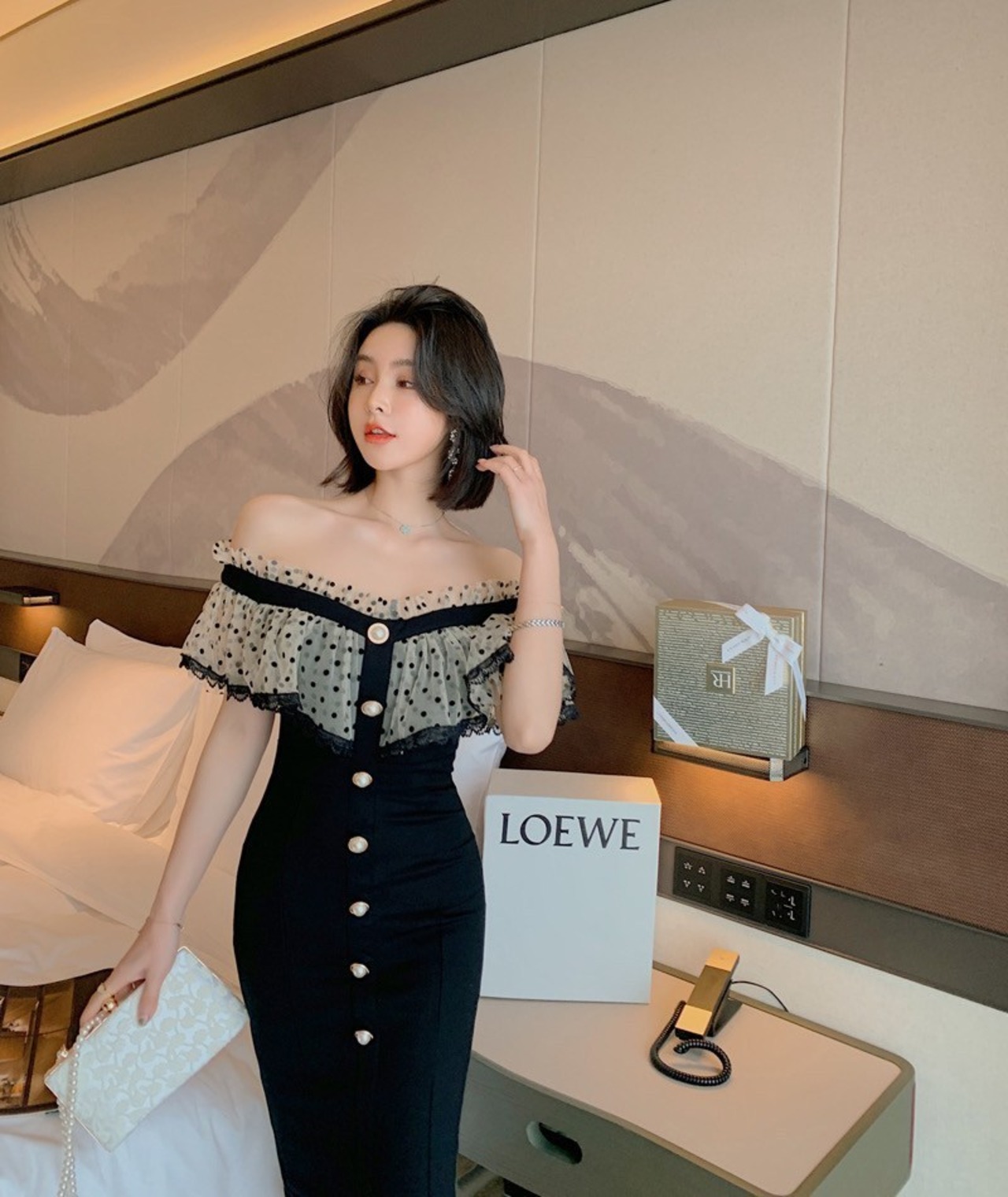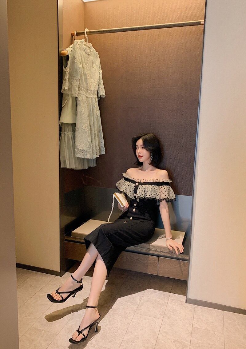 ドレス ミディアム丈 ドット柄 オフショルダー パーティー 韓国 net221023